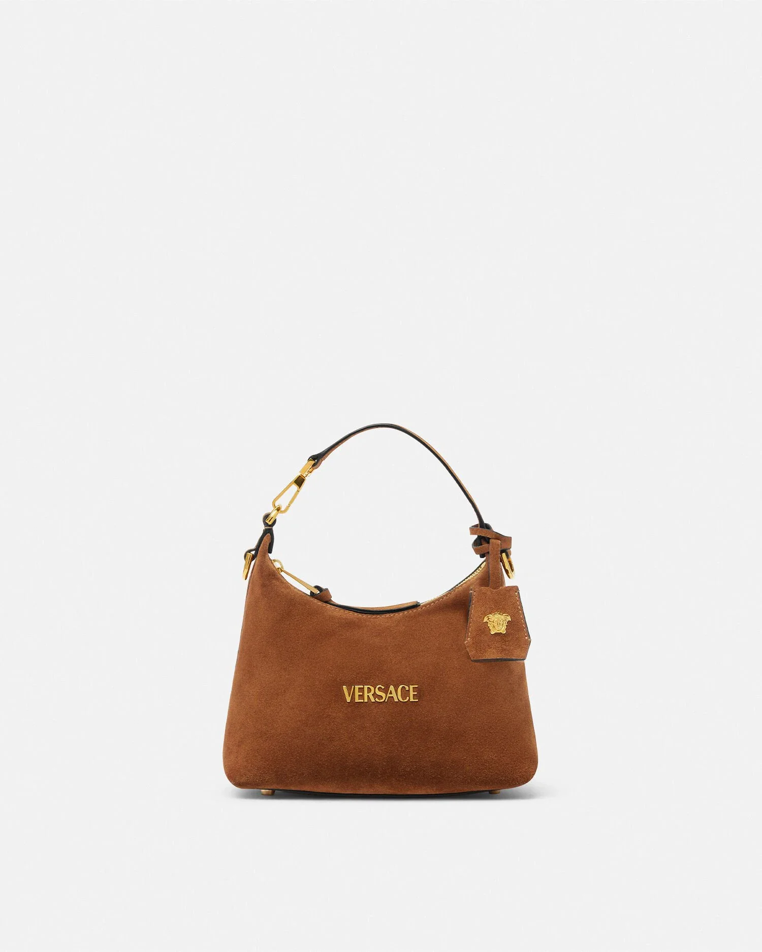 The Versace Tag hobo bag is crafted entirely from suede. The versatile accessory is accented by metal Versace lettering and can easily be carried in-hand by the top handle or crossbody by the detachable and adjustable suede strap. A removable suede tag keychain with Medusa hardware completes the design. - Medusa hardware - Versace Logo lettering - Top zip closure - Top handle - Adjustable and detachable shoulder strap - Removable keychain tag - Outer Composition: 100% Calf Leather - Lining: 100% Polyester Size & Fit - L9.1 x W6.3 x H4.3" / L23 x W16 x H11 cm - Handle drop: L4.7" / L12 cm - Shoulder strap: L49.2" / L125 cm - Shoulder strap drop: L44-19.7-22" / 50-56 cm - Approximate weight: 10.6 oz / 0.3 kg Item: 1018302-1A09892_DTU_UNICA_1NG8V__