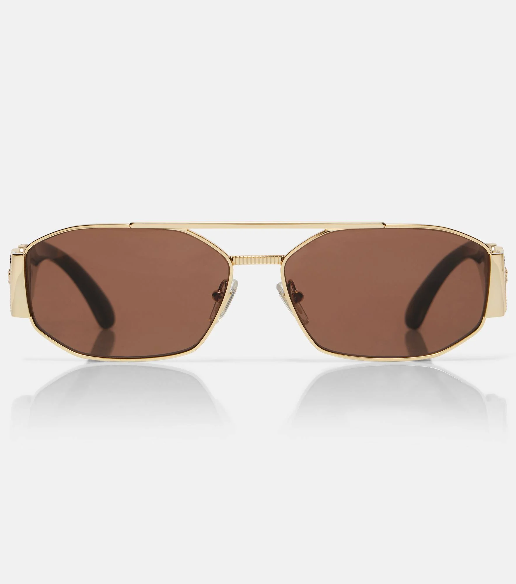 These Versace VE2287 sunglasses from Versace feature a gold metal frame with brown lenses in an aviator shape. Tortoiseshell temples are accented with the signature Medusa head, combining timeless elegance with a modern, fashion-forward appeal. Product Details - Frame material: metal - Frame color: gold - Lens filter category 3 - Color: brown - Lens color: brown - Made in Italy - Includes: case and presentation box, cleaning cloth - The color of the case may vary - Item number: P01121373 Size & Fit - Lens width: 58mm-2.3" - Bridge size: 14mm-0.55" - Earpiece length: 140mm-5.5"