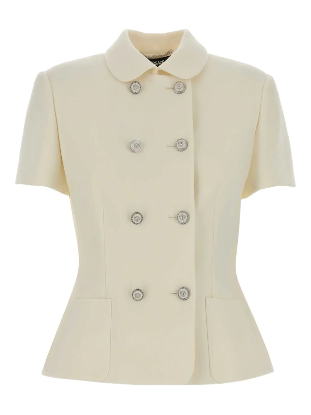 double-breasted blazer Highlights - White - Short sleeves - Double-breasted - Round collar - Button embellishment Made in Italy Composition Recycled Polyester 74%, Viscose 26% Washing instructions Read Manufacturer Guidelines
