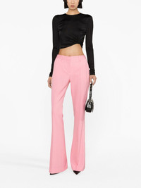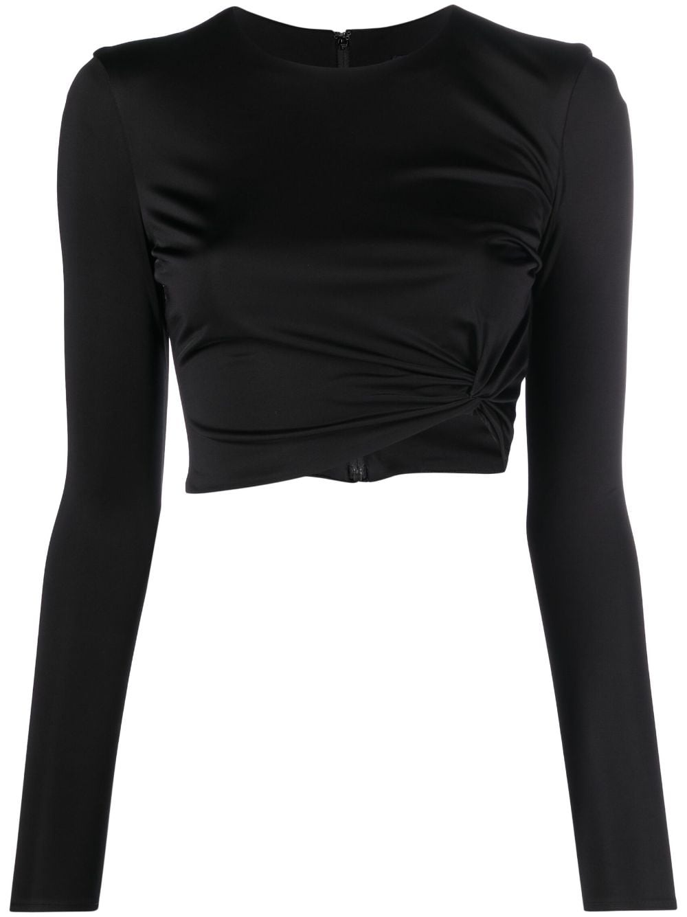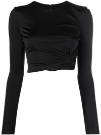 x Dua Lipa knotted crop top Designed in collaboration Dua Lipa, this top fuses the singer’s personal style with Versace’s alluring nature. It’s crafted in black stretch jersey to a slim silhouette that’s knotted at the front to create an asymmetric cropped hem. Highlights - Black - Stretch-jersey - Knot detailing - Crew neck - Long sleeves - Concealed rear zip fastening - Asymmetric hem - Cropped Composition Outer: Viscose 100% Lining: Viscose 100% SIZE & FIT Model measurements Height 5 ft 10 in(1.78 m) Bust/Chest 29.9 in(76 cm) Hips 34.6 in(88 cm) Waist 23.6 in(60 cm) FittingInformation Designed for a slim fit that sits just away from the body offering a close yet comfortable fit Made from a midweight non-stretch fabric, this piece offers minimal elasticity when worn This piece fits true to size – take your usual size