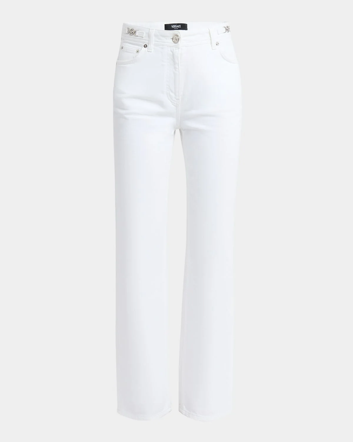 Versace pants in white wash denim with signature silvertone Medusa waist detail Mid rise sits high on hip Fivepocket style Straight legs Full length Button/zip fly; belt loops Cotton Professional cleaning recommended Trim: Leather Made in Italy
