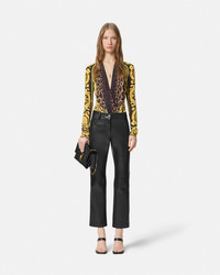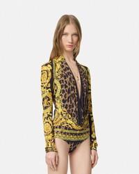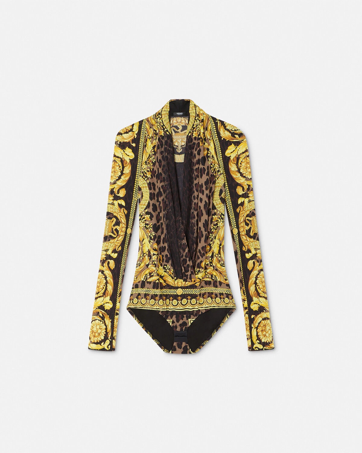 DETAILS A longsleeved bodysuit in a stretch double silk georgette with a fluid draped pleated neckline featuring a leopard print with Barocco motifs - Wild Barocco print - Long sleeves - Plunging neckline - Hook-and-eye closure - Outer composition: 94% Silk, 6% Elastane - Lining: 100% Viscose Item: 1005321-1A12357_5N440 SIZE & FIT - The model is 5'8" / 1.75 m tall and wears size 38 IT