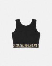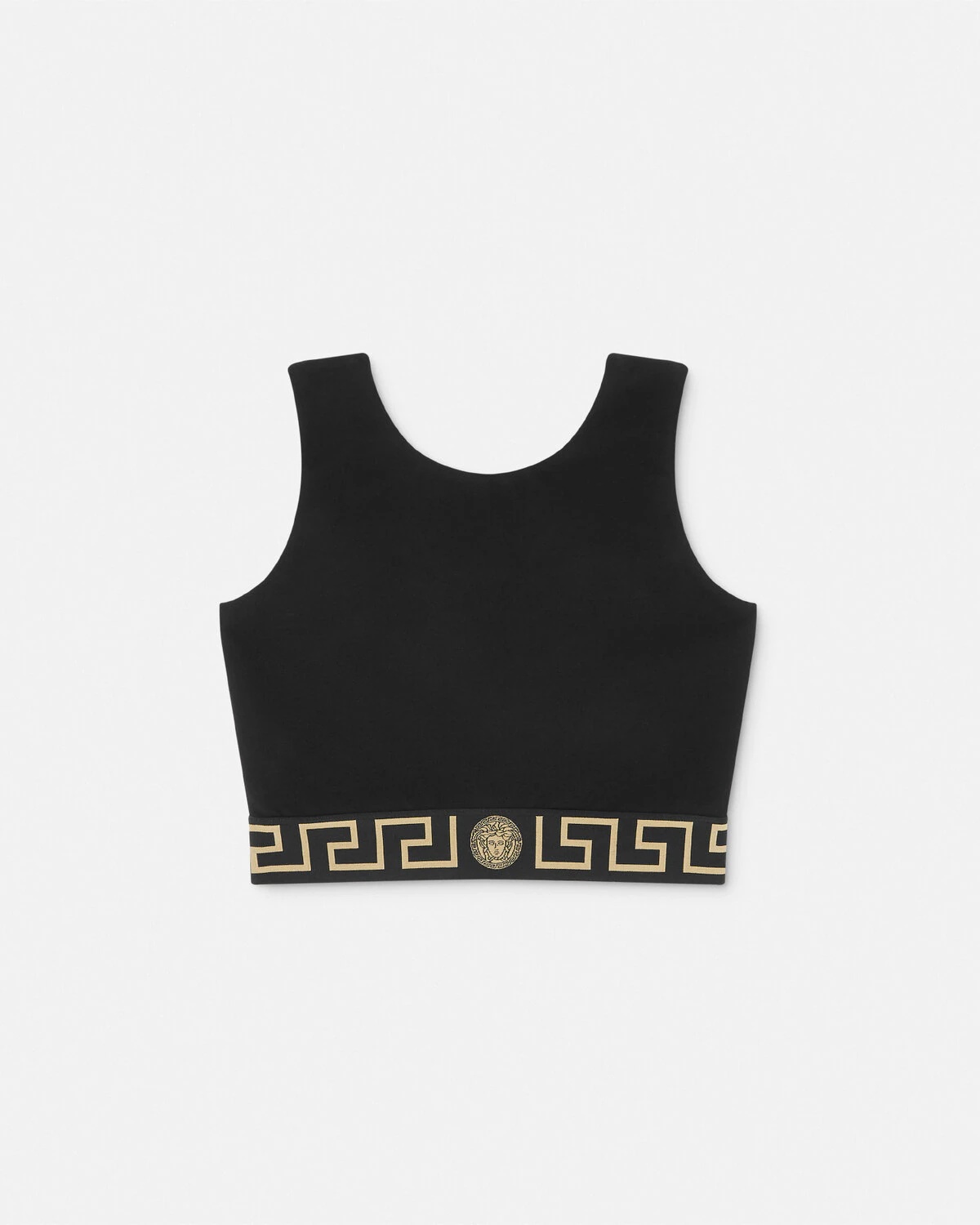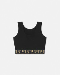 DETAILS Designed for mediumimpact workouts this stretch sports bra features a breathable mesh lining and is accented by an elastic Greca waistband with a central Medusa motif - Greca border - Medusa motif - Sleeveless - Round neckline - Mesh lining - Elastic waistband - Outer composition: 70% Viscose, 21% Nylon, 9% Elastane - Lining: 82% Nylon, 18% Elastane - Trim: 82% Polyester, 9% Elastane, 9% Nylon Item: 1015878-1A11143_1B000