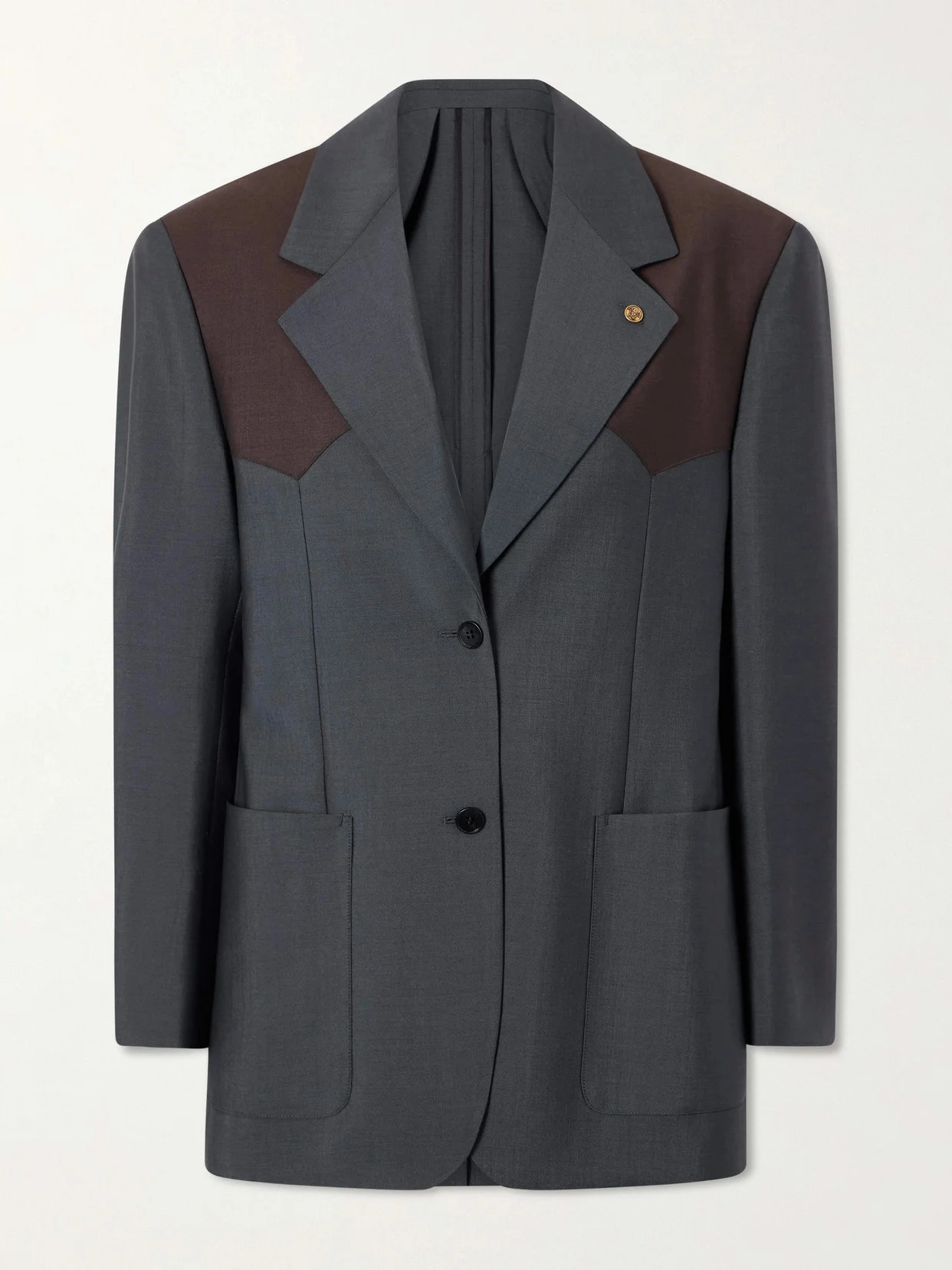 Versace's blazer stands out with its two-tone design. Made from wool and mohair-blend, it is darted to create a fitted silhouette and finished with 'Medusa' hardware on the lapel.