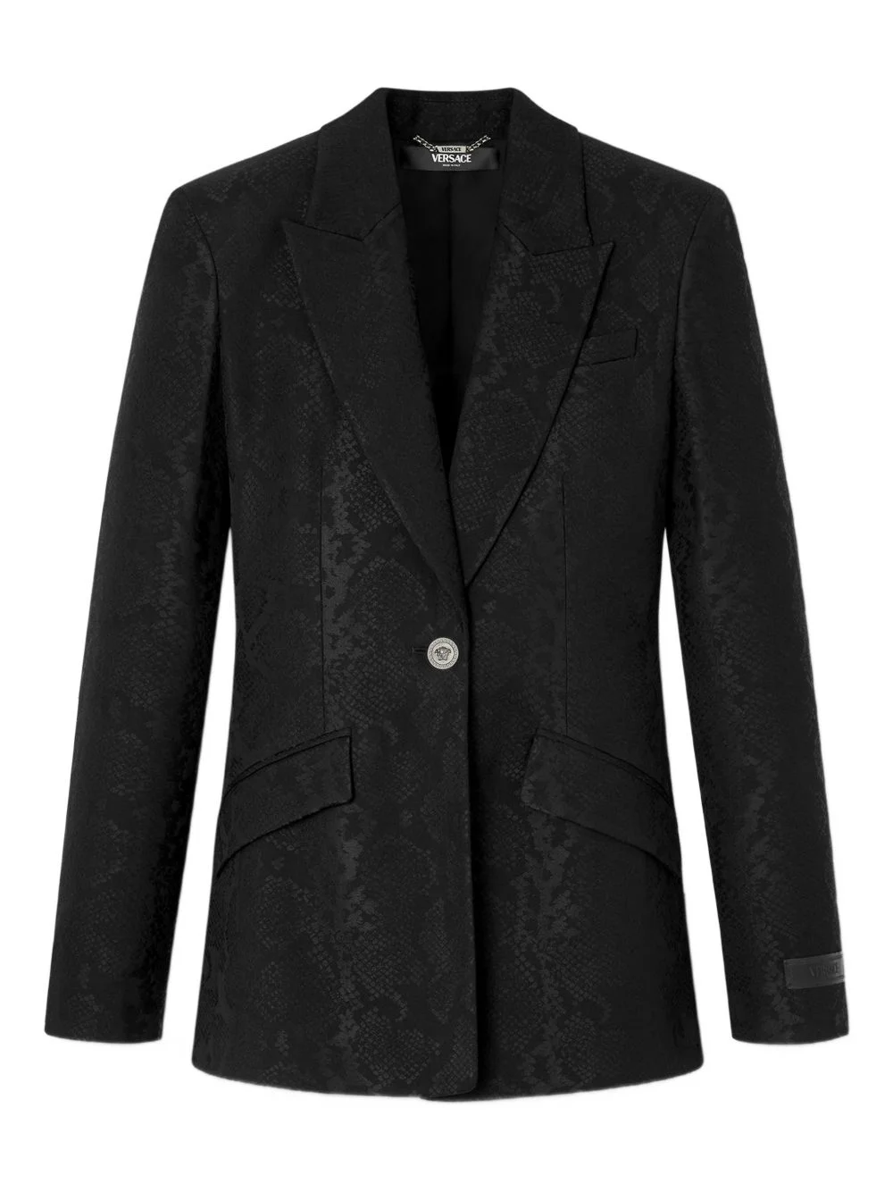 wool-blend blazer Highlights - Black - Snakeskin effect - Button fastening - Front flap pockets - Long sleeves - Logo detail on the sleeve Made in Italy Composition Outer: Virgin Wool 64%, Viscose 36% Lining: Cupro 100% Washing instructions Read Manufacturer Guidelines