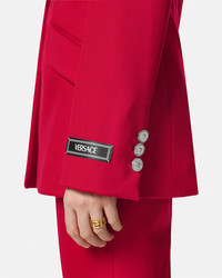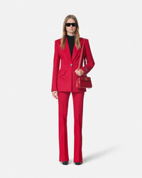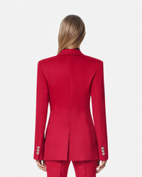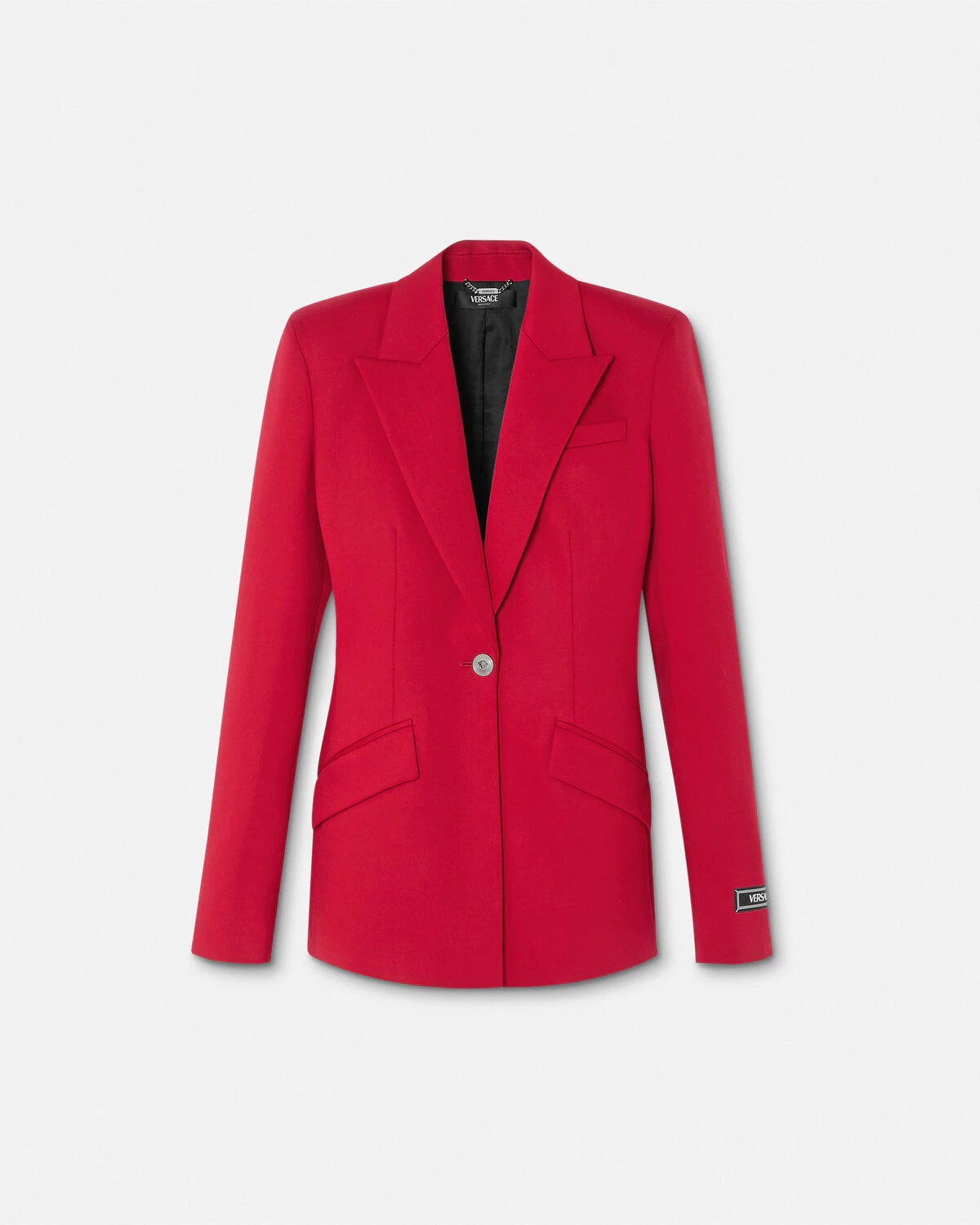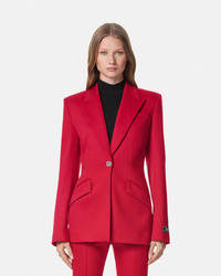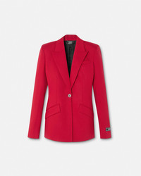 DETAILS A singlebreasted grain de poudre wool blazer in the signature DV silhouette with peaked lapels and a single accent Medusa button The sartorial jacket is fully lined in jacquard Barocco complete with a Versace tailoring label on the sleeve The style can be worn with matching suit pants - Medusa hardware - Barocco lining - Tailoring label - Long sleeves - Front button closure - Chest welt pocket - Front flap pockets - Buttoned cuffs - Back vent - Outer composition: 98% Pure virgin wool, 2% Elastane - Lining: 58% Cupro, 42% Viscose Item: 1009095-1A12258_1RB30 SIZE & FIT - The model is 5'8" / 1.75 m tall and wears size 38 IT