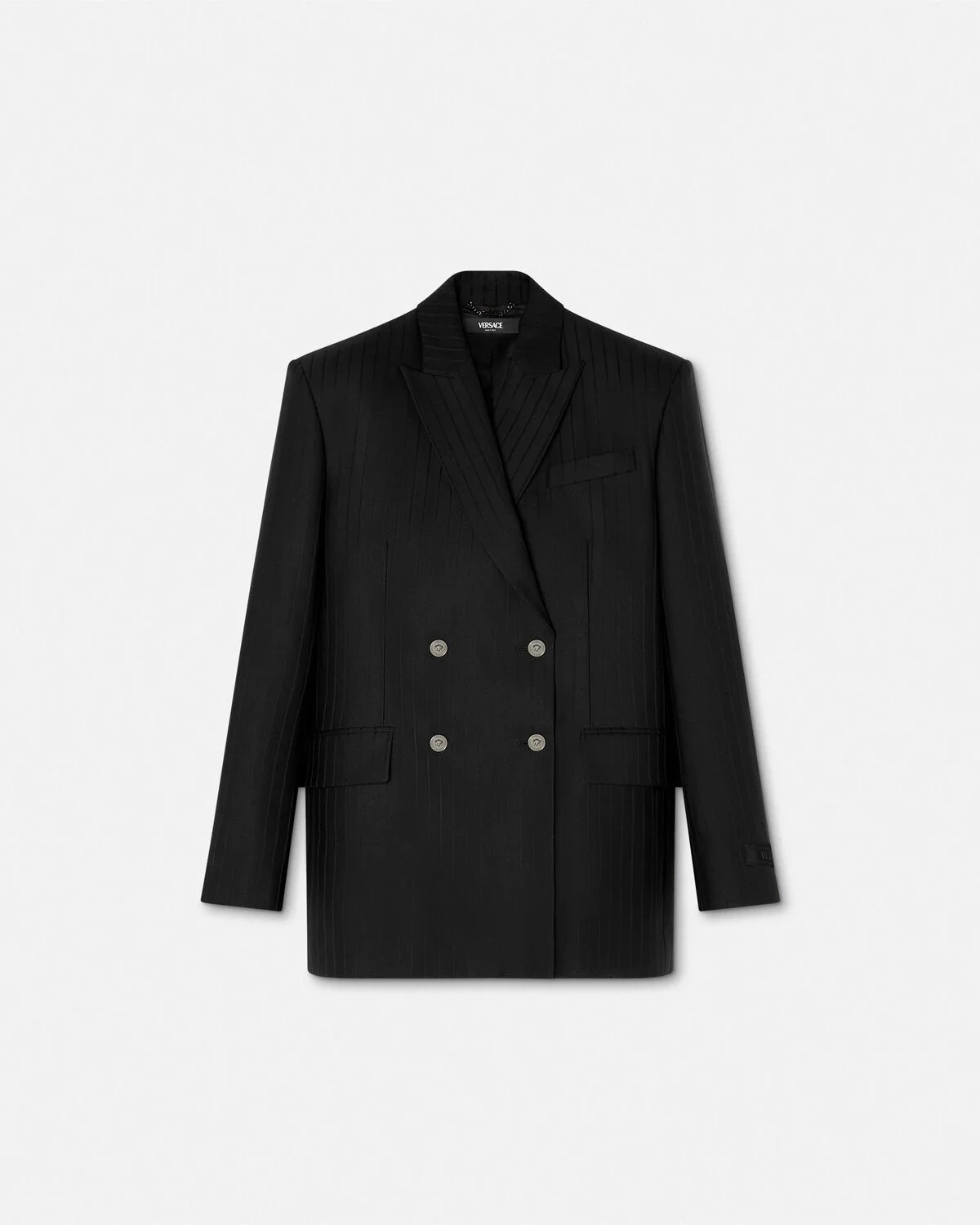DETAILS This virgin wool doublebreasted blazer in tonal pinstripes has sharp padded shoulders and peaked lapels The sartorial style is accented by signature Medusa buttons and a tonal Versace tailoring label on the sleeve - Medusa hardware - Versace tailoring label - Long sleeves - Peaked lapels - Front button closure - Chest welt pocket - Front flap pockets - Single back vent - Outer Composition: 100% Pure Virgin Wool - Lining: 100% Cupro Item: 1021947-1A16260_1B000 SIZE & FIT - The model is 5'10" / 1.78 m tall and wears size 38 IT