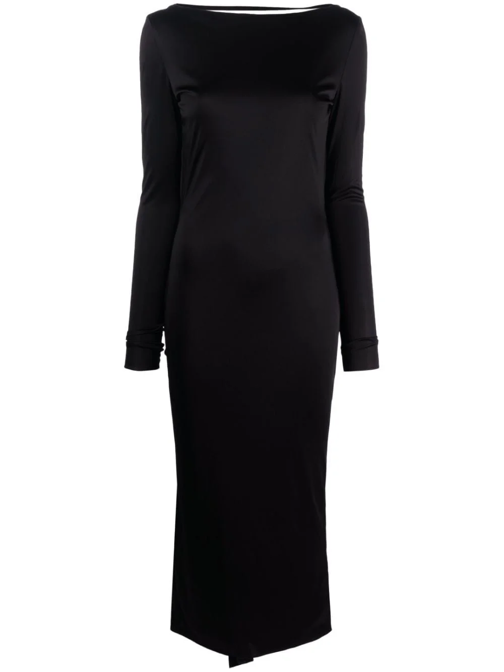 x Dua Lipa knotted backless dress Designed in collaboration Dua Lipa, this dress is the perfect fusion of the singer’s personal style and Versace’s seductive nature. It’s crafted in black jersey to a slinky silhouette that seems demure at from the front, but turns to reveal a draped, back-baring open reverse with a gathered knot that cascades below the midi hemline. Highlights - Black - Jersey texture - Knot detailing - Draped detailing - Boat neck - Backless - Long sleeves - Long length Made in Italy Composition Lining: Viscose 100% Outer: Viscose 100% SIZE & FIT Model measurements Height 5 ft 10 in(1.79 m) Bust/Chest 31.1 in(79 cm) Hips 35.03 in(89 cm) Waist 24.01 in(61 cm) FittingInformation Designed for a slim fit that sits just away from the body offering a close yet comfortable fit Made from a midweight non-stretch fabric, this piece offers minimal elasticity when worn This piece fits true to size – take your usual size Washing instructions Dry Clean Only