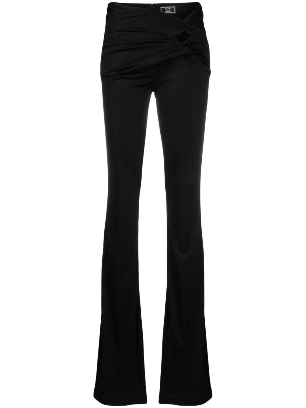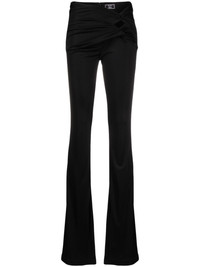 x Dua Lipa knotted flared trousers Cut-outs and knots permeate Versace's co-designed capsule collection with singer-songwriter Dua Lipa, making their way onto these black trousers. They are made from fluid jersey to a low-rise, flared silhouette adorned with the excised and tied detailing, resulting in tactile ruching around the waist. Highlights - Black - Lightweight jersey - Knot detailing - Ruched detailing - Cut-out detailing - Flared - Concealed rear zip fastening - Authenticity qr code Made in Italy Composition Viscose 100% SIZE & FIT Model measurements Height 5 ft 10 in(1.78 m) Bust/Chest 29.92 in(76 cm) Hips 34.64 in(88 cm) Waist 23.62 in(60 cm) Measurement INSIDE LEG 38.58 in(98 cm) HIPS 34.64 in(88 cm) WAIST 31.49 in(80 cm) FittingInformation Designed with a flared hem, these trousers allow for a close fit at the waist with a slim fit over the leg and widening towards the hem Made from a midweight fabric This piece fits true to size – take your usual size