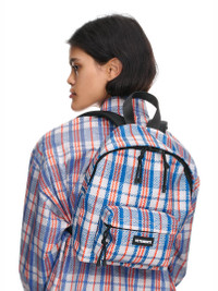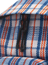 VETEMENTS bag in blue, nylon construction, plaid pattern, top-handle loop, adjustable shoulder straps, main two-way zip pocket, front zip pocket, rubber logo, twill lining. Made in Italy 100% Nylon 11.5" Height, 12" Width, 4" Depth