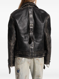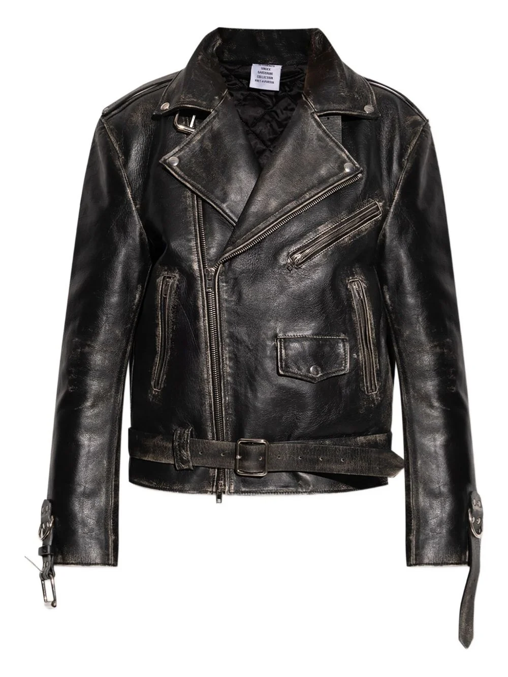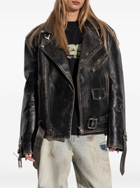 belted distressed leather jacket Highlights - Black - Asymmetric zip fastening - Belted waist - Multiple pockets Imported Composition Leather 100% Washing instructions Read Manufacturer Guidelines