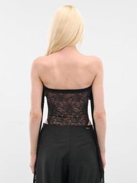 Black open shoulder bodysuit from Vetements in sheer lace with a bandeau neckline and draped sleeves that can be styled on or off the shoulders. Featuring: • Slim fit • Deconstructed design • Strapless bandeau neckline • Sheer lace torso • Draped lace sleeves, worn on or off the shoulders • Made in Italy • Main: 90% Polyamide 10% Elastane • Standard sizing Model is 5'9" wearing size S. Bust: 32" Waist: 25" Hips: 34"