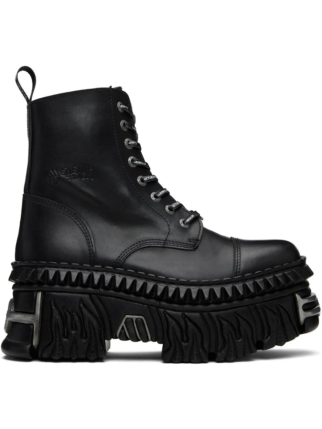 Ankle-high buffed leather boots. · Logo-engraved hardware at toe and heel · Logo hardware at cord-lock lace-up closure · Logo-printed pull-loop at heel collar · Logo embossed at outer side · Zip closure at inner side · Sculptural rubber platform midsole · Treaded rubber sole · Platform: H3.5" Part of the VETEMENTS x New Rock collaboration. Supplier color: Black leather Upper: leather. Sole: rubber. Made in Spain 252669F113004