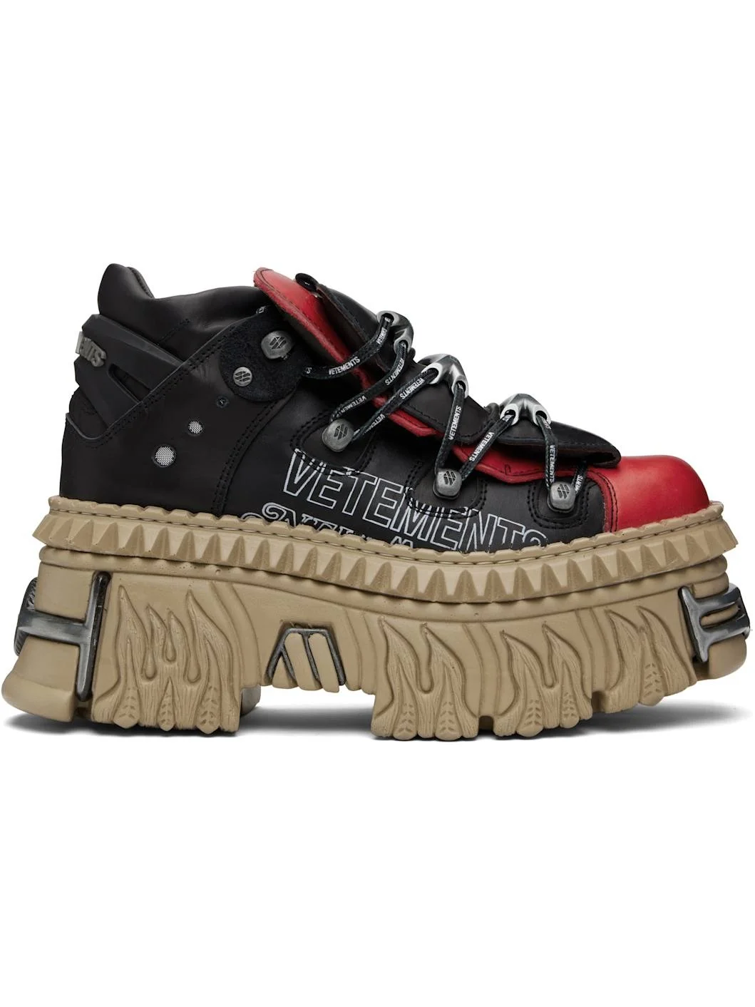 Low-top buffed leather sneakers. · Logo-engraved hardware at toe and heel · Logo plaques at lace-up closure · Layered padded tongue · Padded collar · Mesh eyelets at sides · Logo printed at outer side · Rubberized logo-embossed pull-loop at heel · Sculptural rubber platform midsole · Treaded rubber sole · Platform: H3.5" Part of the VETEMENTS x New Rock collaboration. Supplier color: Black/Logo print Upper: leather. Sole: rubber. Made in Spain 252669F128010