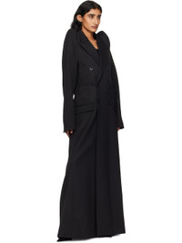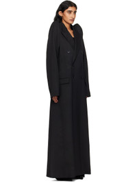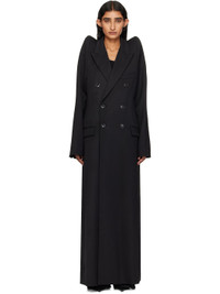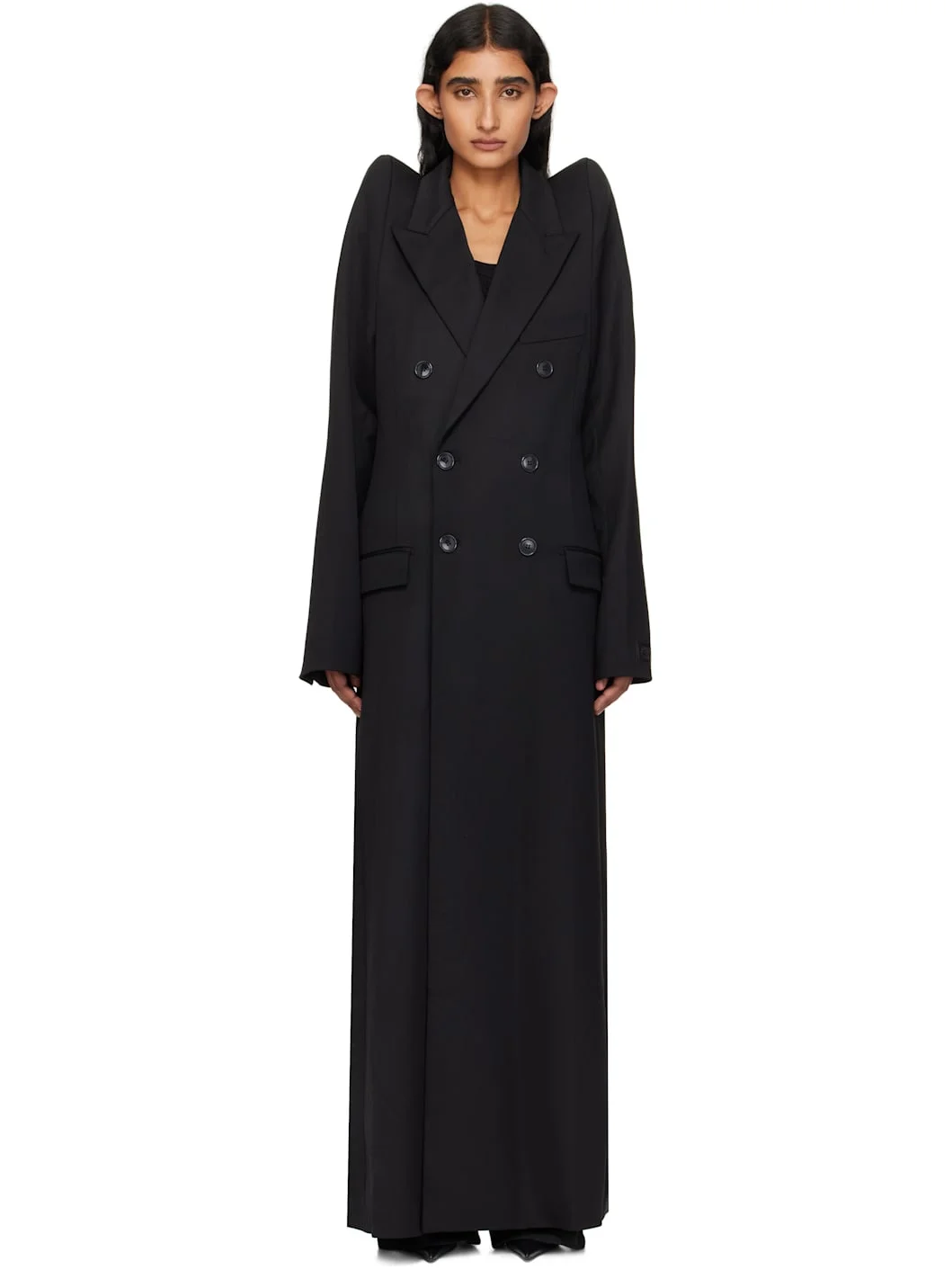 Plain-woven stretch wool coat. · Peaked lapel · Double-breasted button closure · Welt pocket at chest · Flap pocket at waist · Buttoned barrel cuffs · Logo patch at cuff · Central vent at back hem · Structured shoulders · Welt pockets at interior · Full logo-woven satin lining Supplier color: Black Body: 96% wool, 4% elastane. Lining: 100% viscose. Made in Italy 252669F059000