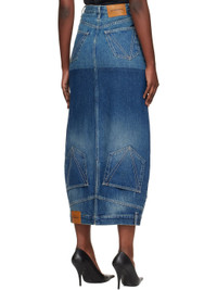 Non-stretch denim midi skirt. · Fading and whiskering throughout · Paneled construction · Belt loops · Five-pocket styling · Button fly · Belt loops and button vent at hem · Logo patch at back waistband and hem · Central vent at back hem · Contrast stitching in white Supplier color: Blue/Navy Body: 100% cotton. Trim: 65% cotton, 35% polyester. Made in Italy 252669F093000