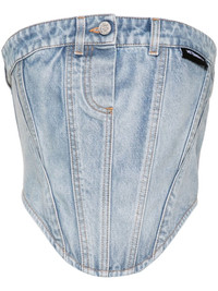 button-up denim corset top Highlights - Light blue - Cotton - Washed denim - Corset style - Mini logo tag - Square neck - Belt loops - Front button fastening - Rear lace-up fastening - Boned bodice - Strapless - High-low hem Made in Italy Composition Cotton 100% SIZE & FIT Model measurements Height 5 ft 10 in(1.78 m) Bust/Chest 29.92 in(76 cm) Hips 34.64 in(88 cm) Waist 23.62 in(60 cm) Measurement CHEST 31.49 in(80 cm) LENGTH 14.56 in(37 cm) WAIST 27.55 in(70 cm) FittingInformation Designed for a very close and sculpting fit The adjustable tie waist gives a more adaptable and personalised fit Sturdy and hard-wearing, this denim piece offers no stretch This piece fits true to size – take your usual size Washing instructions Hand Wash