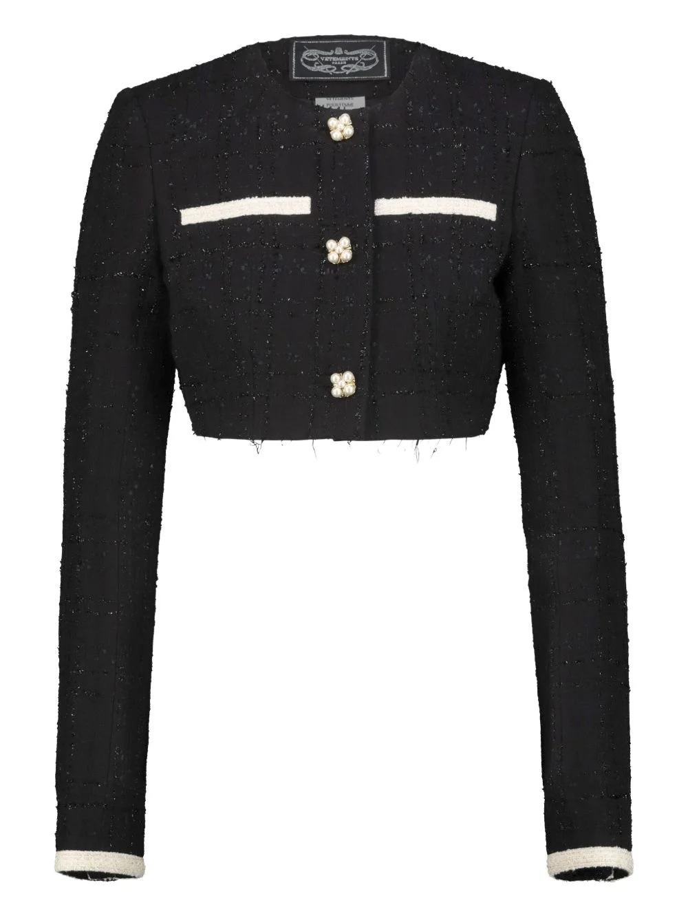 cropped tweed jacket Highlights - Black - Tweed texture - Pearl button fastening - Contrasting trim - Collarless - Raw-cut hem - Long sleeves - Cropped design Made in Italy Composition Wool 100% Washing instructions Read Manufacturer Guidelines