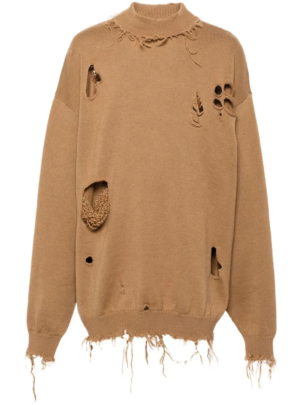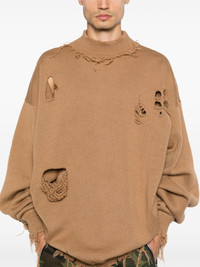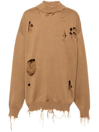 Destroyed sweater Highlights - Ochre brown - Wool - Ribbed knit - Distressed finish - Raw-cut finish - Crew neck - Drop shoulder - Extra-long sleeves - Ribbed cuffs and hem - Thigh-length - When buying this unisex item, keep in mind that it is graded in standard men's sizing. Made in Italy Composition Wool 100% SIZE & FIT Model measurements Height 6 ft 1 in(1.86 m) Bust/Chest 37.4 in(95 cm) Hips 36.22 in(92 cm) Waist 29.52 in(75 cm) FittingInformation This unisex piece is designed for an oversized fit whether you usually select women's or men's sizes Made with a midweight knit, this piece offers some stretch