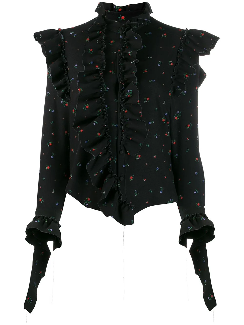 floral print ruffled shirt Demna Gvasalia delivers collections that are quirky, avant-garde and eccentric. Vetements' Autumn/Winter 2019 Collection is no exception. This black floral print ruffled shirt from Vetements features a stand up collar, long sleeves and a front placket. Imported Composition Polyester 92%, Spandex/Elastane 8% SIZE & FIT Model measurements Height 5 ft 10 in(1.77 m) Bust/Chest 30.7 in(78 cm) Hips 35.43 in(90 cm) Waist 23.62 in(60 cm) FittingInformation This piece fits true to size. We recommend you get your regular size Cut for a relaxed fit Made with a mid-weight stretch fabric Washing instructions Hand Wash