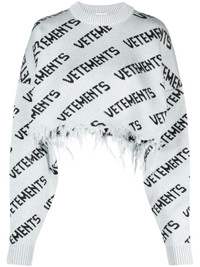 frayed-hem intarsia-knit jumper Highlights - White/black - Knitted construction - Intarsia-knit logo - Cropped - Crew neck - Drop shoulder - Long sleeves - Ribbed trim - Frayed hem - When buying this unisex item, keep in mind that it is graded in standard men's sizing. Made in Italy Composition Viscose 52%, RWS Merino Wool 33%, Polyester 15% SIZE & FIT Model measurements Height 6 ft 0 in(1.84 m) Bust/Chest 35.82 in(91 cm) Hips 37 in(94 cm) Waist 28.34 in(72 cm) FittingInformation Designed to be unstructured, offering a loose fit throughout This unisex piece is designed for a loose fit whether you usually select women's or men's sizes Made with a midweight knit, this piece offers some stretch Made with a midweight knit, this piece offers some stretch This piece fits true to size – take your usual size Washing instructions Hand Wash