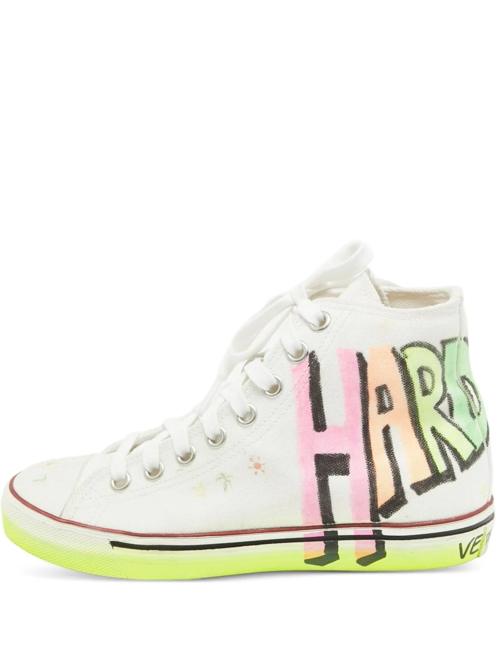 graffiti high-top sneakers Highlights - White - Canvas - Graffiti print - Pink green sole - Lace-up closure - Flat sole - Condition: good. this previously owned and used item is in good condition with minimal signs of use. this may include fading of material or plating and scratches. Made in Italy Composition Sole: Rubber 100% Outer: Canvas 100% Lining: Canvas 100%
