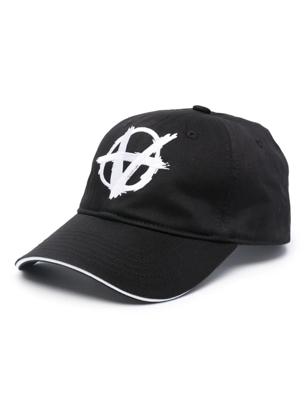 logo-embroidered cotton cap Made from cotton, this baseball cap by VETEMENTS is highlighted by the brand's Anarchy logo printed at the front, bringing contrast against the black background. To the rear, the touch-strap fastening ensures an adjustable fit. Highlights - Black - Cotton - Tonal stitching - Curved peak - Six-panel construction - Embroidered logo to the front - Fabric-covered button at the crown - Embroidered logo to the rear - Adjustable strap to the rear Imported Composition Cotton 100% SIZE & FIT Measurement BRIM 2.75 in(7 cm) CIRCUMFERENCE 22.04 in(56 cm) Washing instructions Dry Clean Only