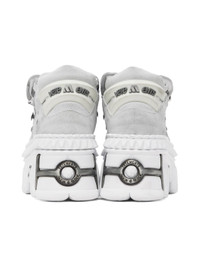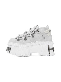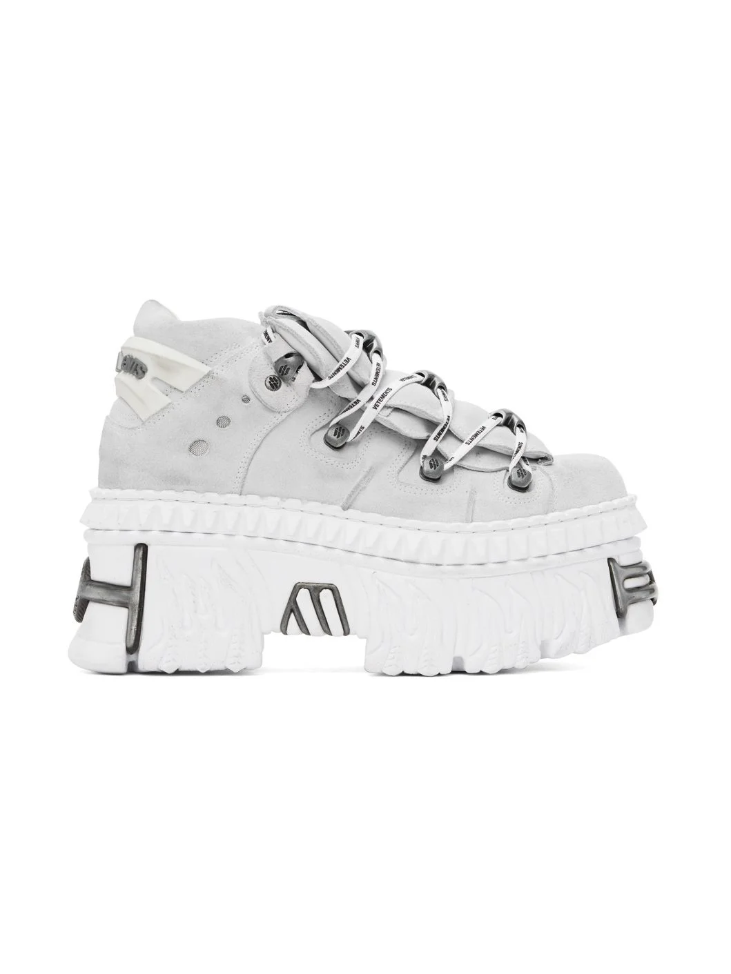 Low-top suede sneakers in off-white. · Logo printed and embossed throughout · Graphic hardware at toe and heel · Cord-lock lace-up closure · Padded layered tongue · Padded collar · Rubberized pull-tab at heel counter · Buffed leather lining · Cushioned jersey insole · Graphics embossed at platform rubber midsole · Treaded rubber sole · Logo-engraved antiqued silver-tone hardware · Platform: H3.25" Part of the VETEMENTS x New Rock collaboration. Supplier color: White Upper: leather. Sole: rubber. Made in Spain 242669F128000