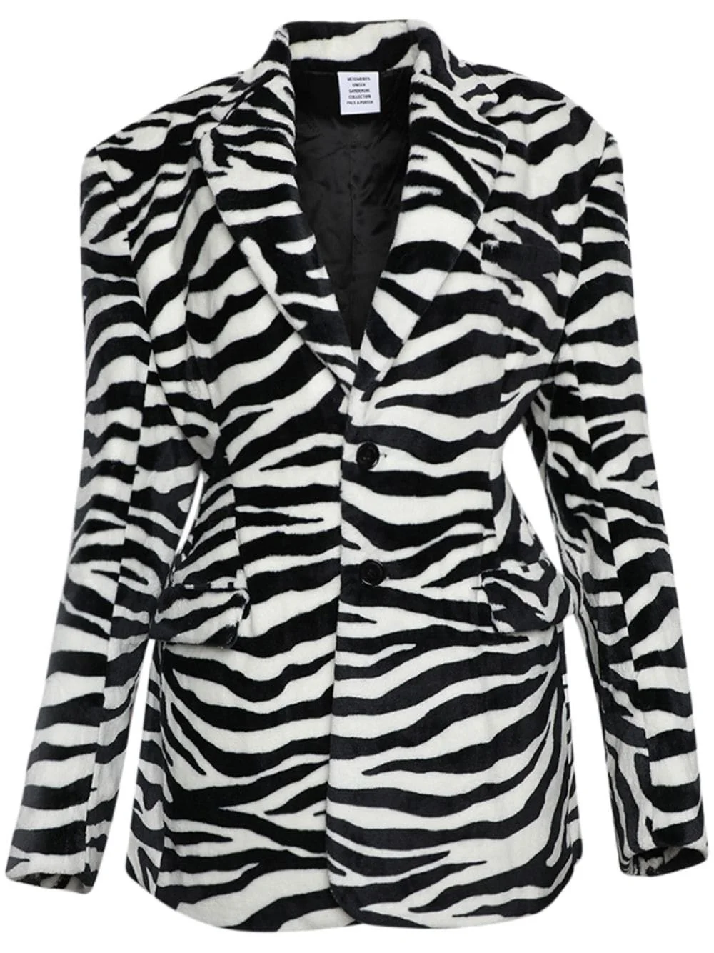 oversize-shoulder zebra-print blazer Highlights - White/black - Zebra print - Shoulder pads - Notched lapels - Front button fastening - Two front flap pockets - Long sleeves - Straight hem Imported Composition Polyester 100%