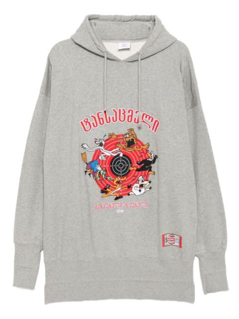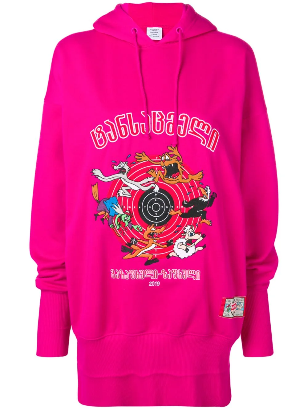oversized printed hoodie Pink cotton oversized printed hoodie from Vetements featuring a hood with drawstring tie fastenings, long sleeves, a ribbed hem and cuffs and a print to the front. Imported Composition Cotton 100% SIZE & FIT Model measurements Height 5 ft 11 in(1.8 m) Bust/Chest 34.64 in(88 cm) Hips 36.22 in(92 cm) Waist 24.4 in(62 cm) Washing instructions Machine Wash
