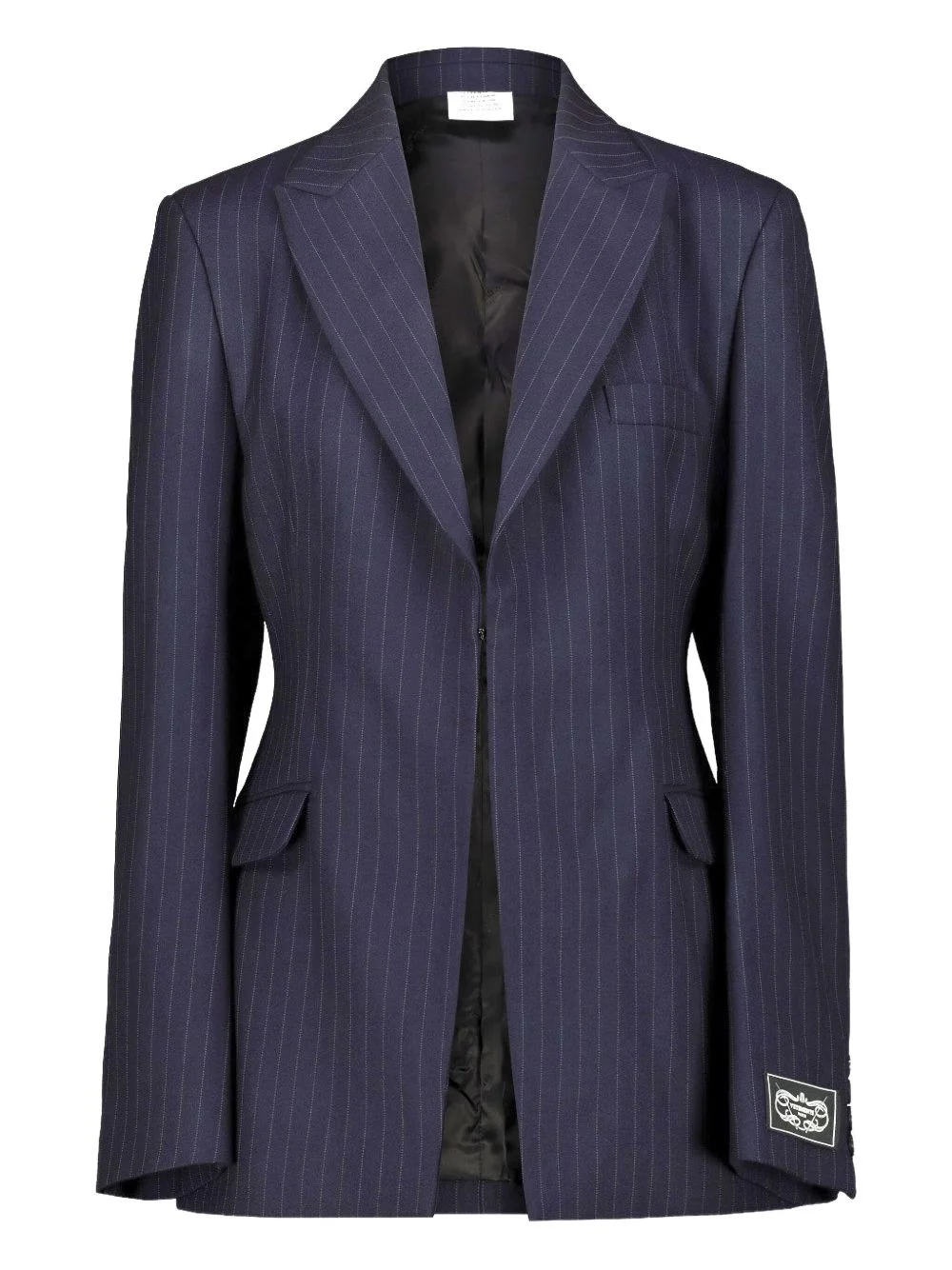 pinstriped hourglass jacket Highlights - Blue - Wool - Concealed hook fastening - Side slits on the back - Logo patch on the sleeve Made in Italy Composition Wool 100% Washing instructions Read Manufacturer Guidelines