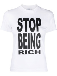 slogan print T-shirt Famed for its irreverent and self-referential aesthetic, this T-shirt from Vetements features a classic crew-neck silhouette that’s enhanced with a seasonal slogan print inspired by noughties pop culture. Imported Composition Cotton 97%, Elastane 3% SIZE & FIT Model measurements Height 5 ft 10 in(1.79 m) Bust/Chest 31.49 in(80 cm) Hips 35.03 in(89 cm) Waist 23.62 in(60 cm) FittingInformation This piece fits true to size. We recommend you get your regular size Cut for a slim fit Made with a mid-weight stretch fabric