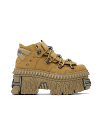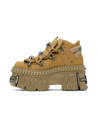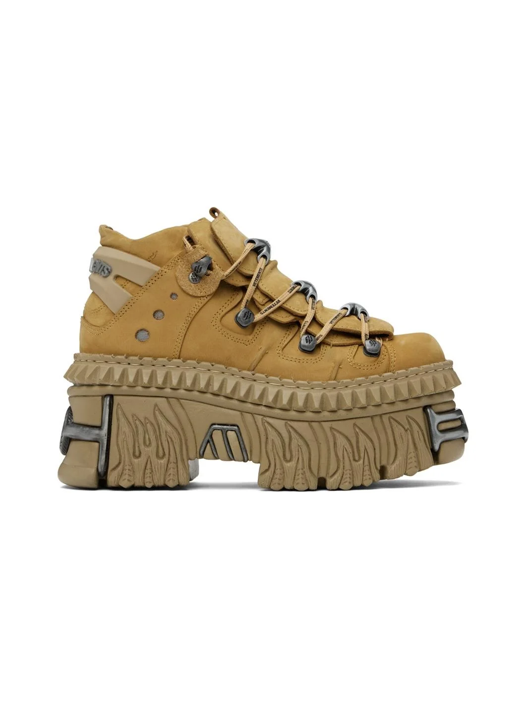 Low-top nubuck sneakers in tan. · Logo printed and embossed throughout · Graphic hardware at toe and heel · Cord-lock lace-up closure · Padded layered tongue · Padded collar · Rubberized pull-tab at heel counter · Buffed leather lining · Cushioned jersey insole · Graphics embossed at platform rubber midsole · Treaded rubber sole · Logo-engraved antiqued silver-tone hardware · Platform: H3.25" Part of the VETEMENTS X New Rock collaboration. Supplier color: Caramel Upper: leather. Sole: rubber. Made in Spain 242669F128003