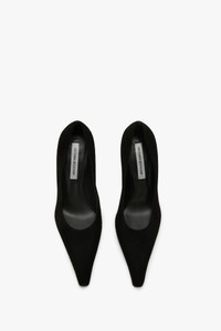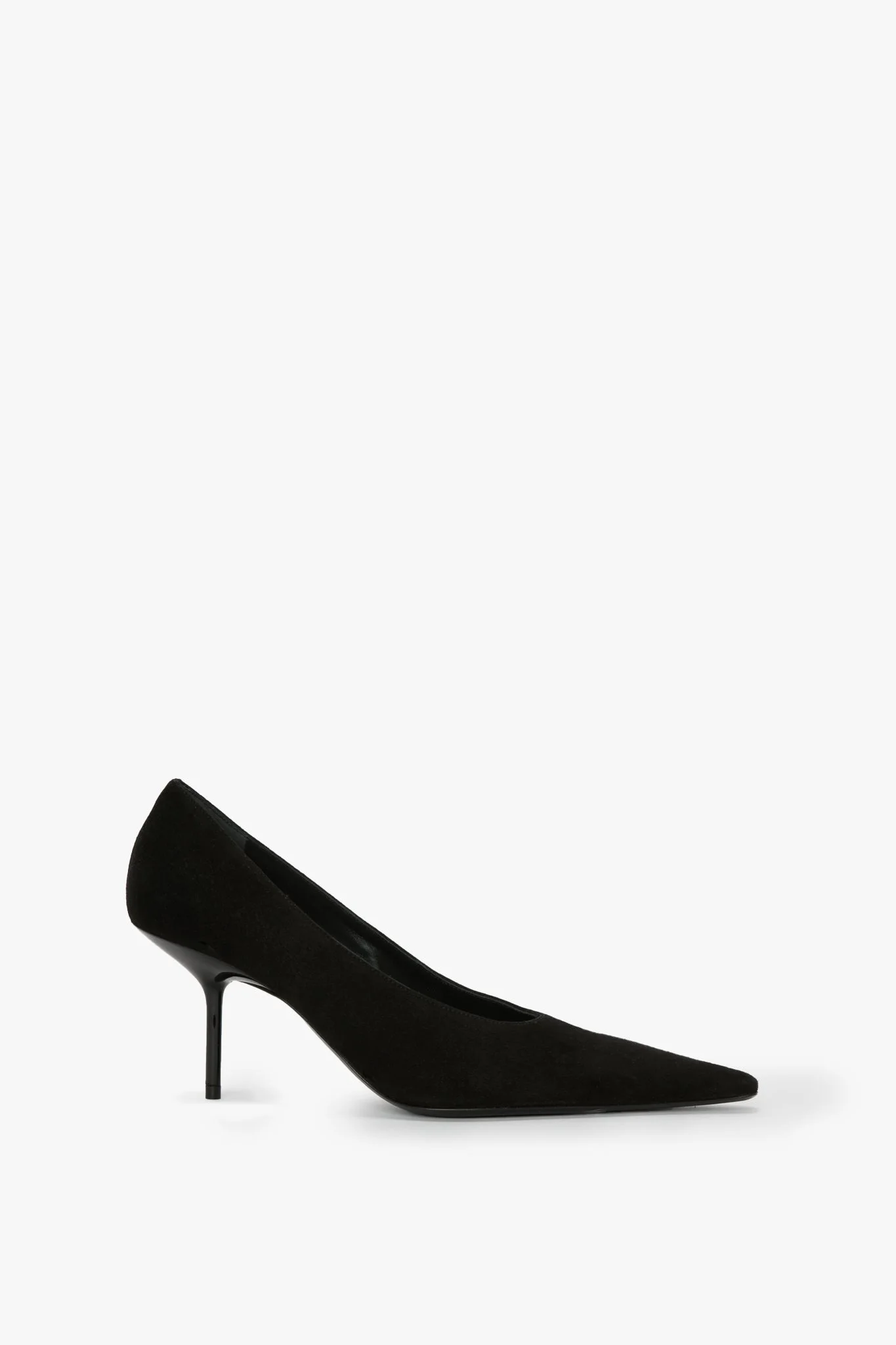Crafted in Italy and designed with a pinched, closed toe, which is elongating and elegant, the Stiletto Heel Mule In Black suede has a black lacquered 75mm stiletto for a textural contrast. A woven brand label stitched to the insole adds a subtle but sophisticated design detail, while a padded insock and leather lining complete the look. Size & Fit - 75mm stiletto heel - Fits true to size, take your regular size Product Details - Pinched, elongated closed toe shape - Black lacquered heel - Suede upper - Leather lining - Padded in-sock for added comfort - Woven brand label stitched to the insole - Suede - Made in Italy
