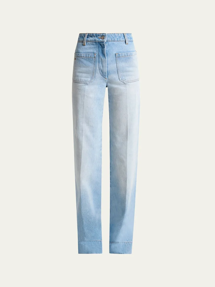 Victoria Beckham "Alina" jeans are crafted from faded lightwashed denim accented with front patch pockets High rise Front and back patch pockets Leather logo patch on the back Flared legs Full length Button/zip fly; belt loops Cotton Made in Italy
