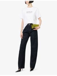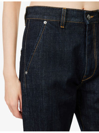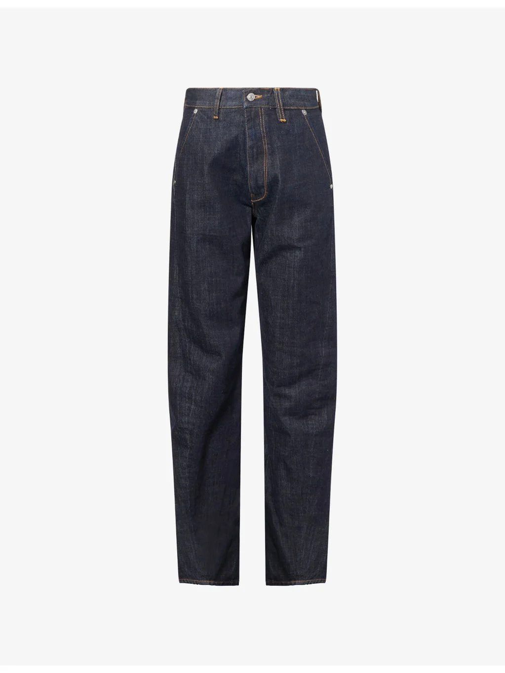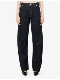 PRODUCT DETAILS - Victoria Beckham denim jeans - 100% cotton - Exposed button and concealed zip-fly fastening at front - Regular fit, high-rise, straight leg, structured waistband with belt loops, two side slant pockets, branded silver-toned hardware, two rear patch pockets, contrast stitching brand patch at back, dark wash - Machine wash at 30°C - True to size - Size 26: rise 11in / 28cm, inside leg 33.5in / 85cm, leg opening 17in / 43cm - Model is 5ft 10in/1.78m and wears a size 26 - Midweight, non-stretch Ref: R04536542