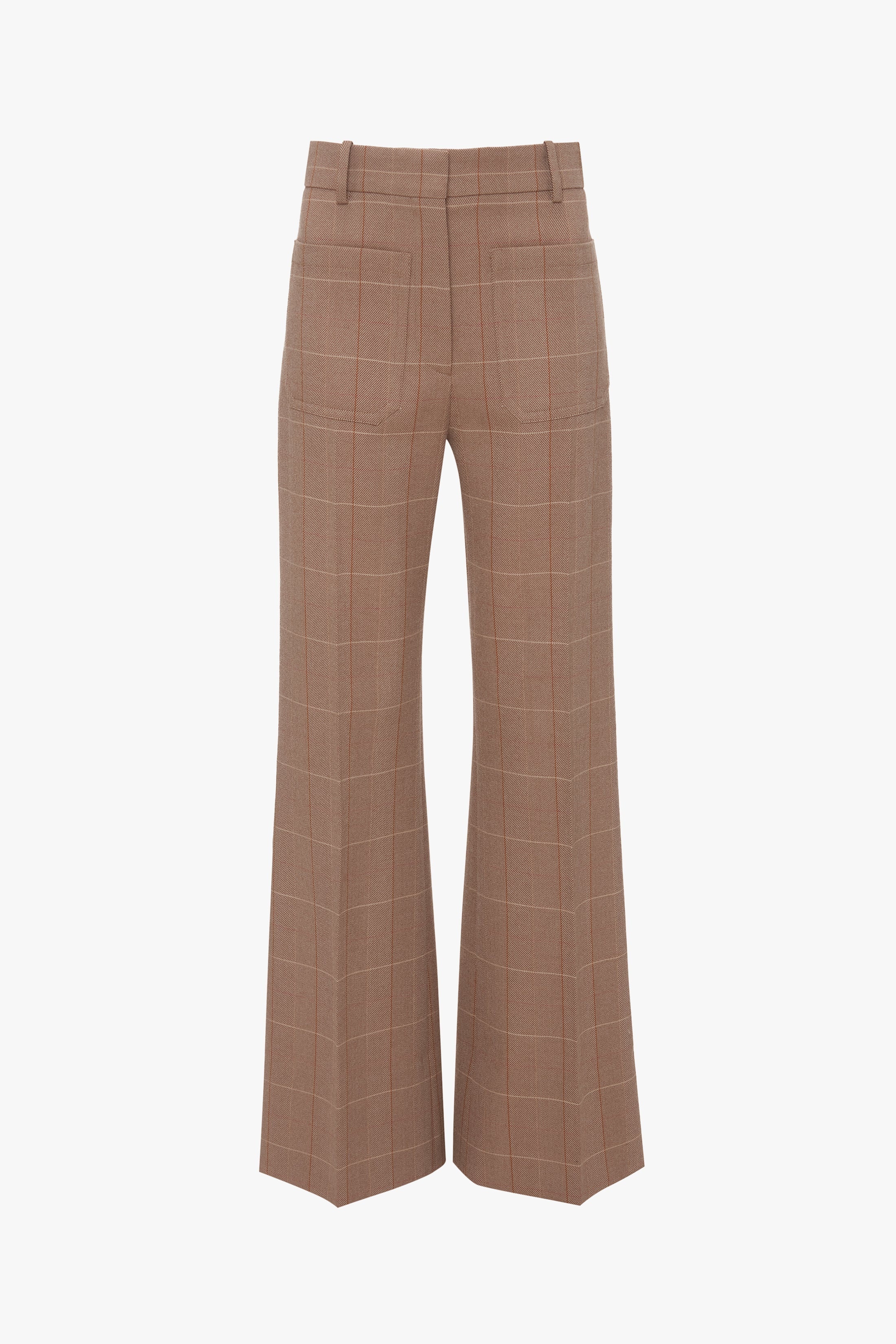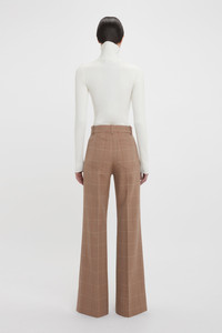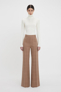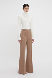 Immaculately tailored trousers are one of the house’s hallmarks. A classic from the Victoria Beckham archive, the Alina trouser draws on 1970s-style references and adds the brand’s signature modern flair. Crafted in a classic windowpane check, the structured trouser has a super-high waist, flared leg for an elongated silhouette and attractive patch pockets. Red contrast topstitching at the back right pocket and belt loop adds a unique point of difference. Styled with the Half Zip High Neck Top & Patch Pocket Jacket Product Details - High rise - Mid-weight structured fabrication - Front and back patch pocket detail - Wide leg - Intended to be fitted around the waistline, take a larger size for a more relaxed fit - The model is 178cm and is wearing a size 6 - Main: 53% Polyester 43% Virgin Wool 4% Elastane, Lining: 70% Cotton 30% Polyamide - Dry clean only - Made in Portugal
