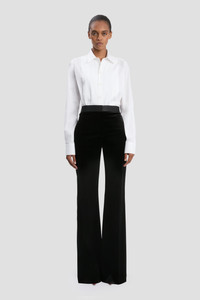 A classic from the Victoria Beckham archive, the Alina Trouser is reimagined in refined Black velvet for the new season. Drawing on 1970s style references, the structured Alina has a super-high waist and flared leg for a well-proportioned silhouette. Side pockets and back satin jet pockets complete the look. Size & Fit - Fits true to size, take your normal size - The model is 5'11’’/180cm and is wearing a size 6 Product Details - Velvet tailored trouser - High rise - Wide leg - Zip fly with double hook & bar closure - Side pockets - Back satin jet pockets - The model is 5'11’’/180cm and is wearing a size 6 - 53% Polyester 43% Wool 4% Elastane - Made in Portugal - Fits true to size, take your normal size