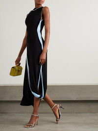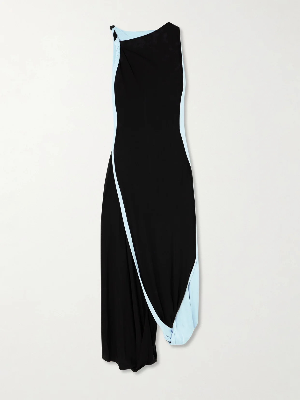 Victoria Beckham's dress is made from panels of black and light-blue jersey, which are elegantly draped and twisted to create a layered effect. It has a chic cowl neckline and beautifully skims your figure as it falls to an asymmetric hem. Wear it with sculptural accessories.