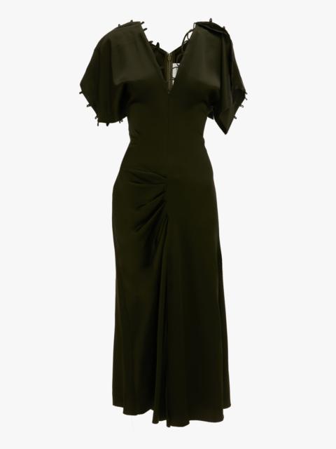 Crafted from crepe back satin, this wear-anywhere midi dress is distinguished by a refined rouleaux detail at the sleeves and neckline. Fitted at the bodice, waist and hip, with a pleat detail skirt and asymmetric hemline, it has a sophistication rooted in modern femininity. Elegant draped sleeves and a V neckline complete the look, while the vibrant shade of Cayenne makes a confident statement. Size & Fit - The model height is 5'10’’/178cm and is wearing a size 6 - Style is fitted through the body, customers inbetween sizes may wish to size up Product Details - Crepe back satin, draped, rouleau detail midi dress - V-neckline - Draped sleeves with rouleau detail at sleeve hems and neckline - Pleat detail at front skirt - Asymmetric hem with centre front split detail - Fitted through bust, waist and hip - 71% Acetate 29% Viscose - Dry Clean Only - Made in Portugal