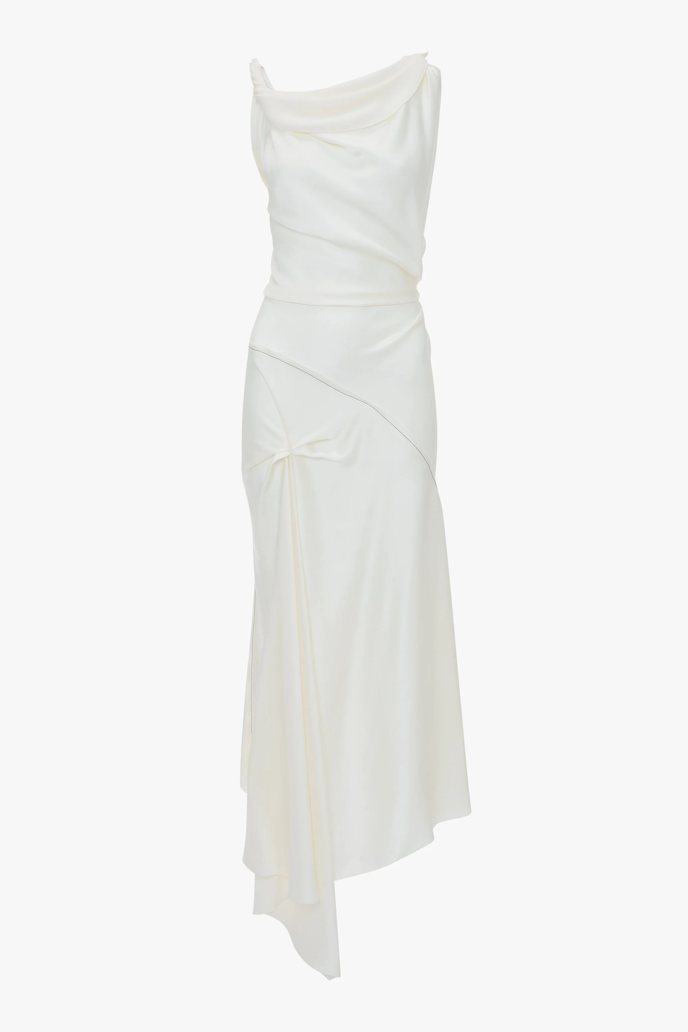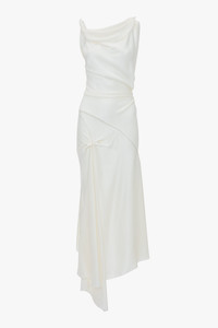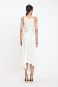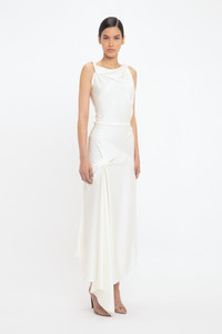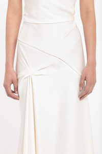 Crafted in luxurious crepe back satin and presented in a nostalgic shade of ivory, the Asymmetric Draped Midi Dress has a modern romance. Tactile features such as a twisted shoulder detail and elegant drape at the front of the skirt add sensuous points of difference, while an asymmetric hemline brings a directional edge. Exposed seams and contrast topstitching complete the look. Product Details - Twist detail on shoulder straps - V-shape back waist seam - Front skirt drape - Exposed seams and contrast topstitching details - Asymmetric hem - Concealed zip with hook and eye closure at back - Fitted at the waist - Fits true to size, take your regular size - The model height is 5'10''/179cm and is wearing a size 6 - 71% Acetate 29% Viscose - Dry clean only - Made In Portugal