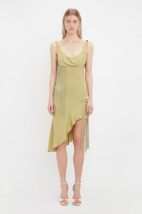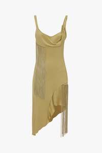 With an asymmetric hemline and body-skimming cut, the Fringe Mini Dress has a sensuous silhouette. Fringed detailing to the front and back and a frill design to one side add a modern playfulness. Twisted straps and elegant draping along the bust line add texture and interest. Product Details - Crepe back satin fabrication - Cami midi - Asymmetric hem - Back drape detail with fringe - Twisted detailed straps - Fits true to size, take your regular size - The model height is 177cm and is wearing a size 6 - 71% Acetate 29% Viscose - Dry clean only - Made in United Kingdom
