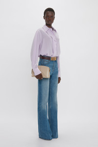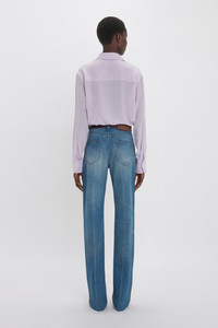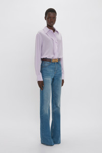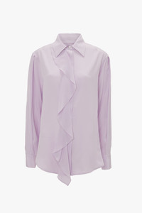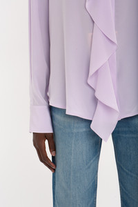 Crafted in tactile silk, the Asymmetric Ruffle Blouse has a single asymmetric ruffle drape detail cascading down its front and full-length sleeves with light volume at the cuff. A collared neckline creates a contemporary contrast with the fluid aesthetic. Presented in an ethereal shade of Petunia, it has a romantic sensibility. Styled with the Julia Jean, Jumbo Frame Belt and the Victoria Clutch Bag Product Details - Fluid fabrication - Classic collared neckline - Full length sleeve with light volume at cuff - Centre front button fastening - Asymmetrical ruffle detail - Fits true to size, take your regular size - The model height is 176cm and is wearing a size 6 - 100% Silk - Dry Clean Only - Made In Portugal