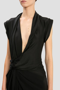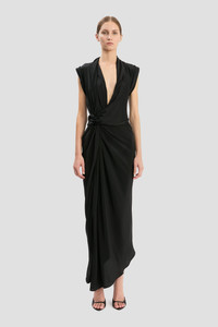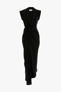A reimagining of the classic little black dress, the Asymmetric Twist Detail Dress has a wrap-front neckline with button closure, front skirt split and directional asymmetric hemline. Tactile talking points, including a short sleeve with rolled hemline, twisted drape neckline and high-shine bodice, bring a subtle sensuality to this polished but provocative midi dress. Product Details - Asymmetric, drape midi dress - High shine jersey bodice - Crepe de chine skirt - Wrap front neckline with button & thread loop closure - Short roll sleeve - Twist drape waist detail - Front skirt split - Concealed side zip - 100% Silk - Made in Portugal