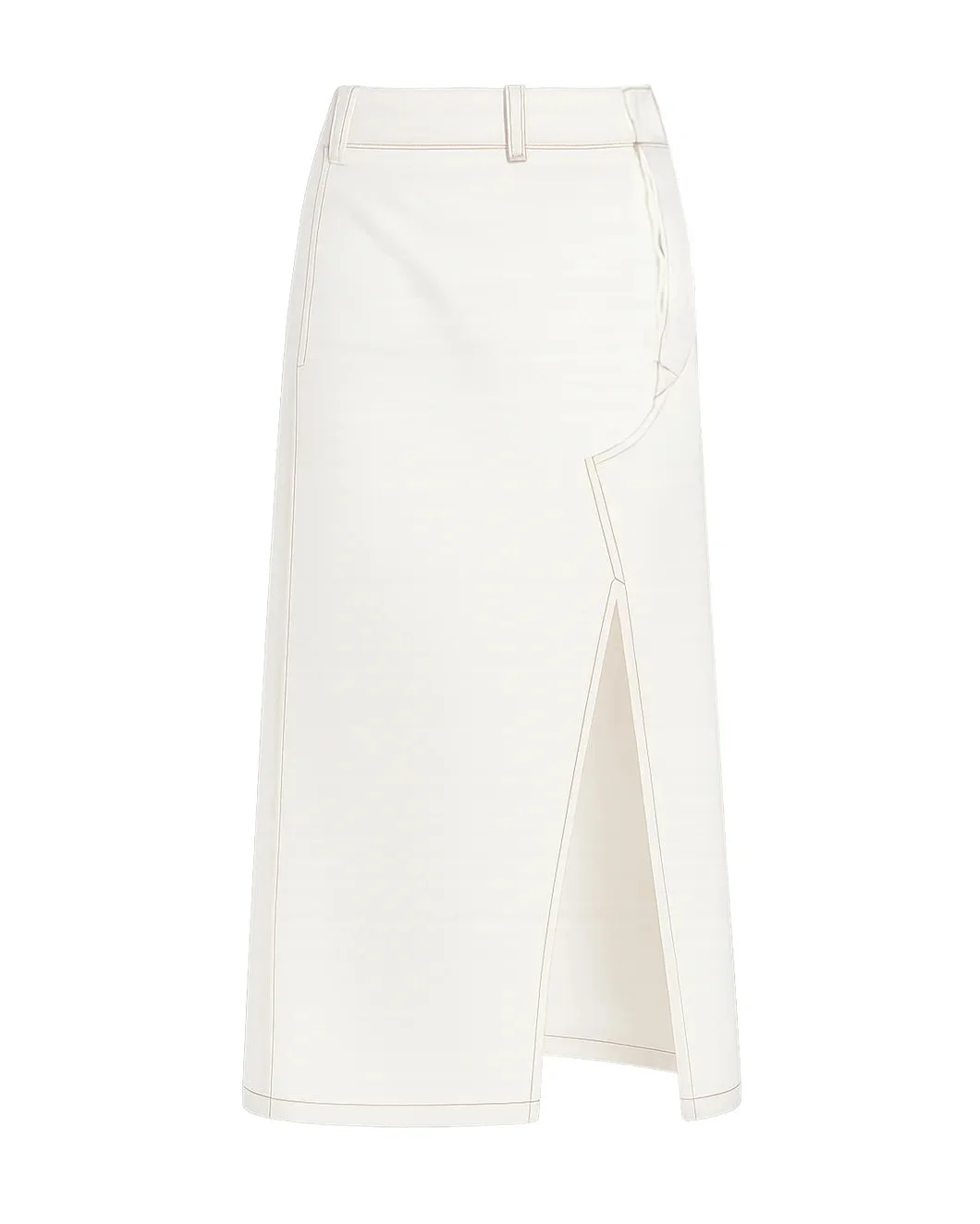 The Asymmetric Utility Skirt in Washed White by Victoria Beckham is a white denim skirt featuring a twisted, asymmetric design featuring tobacco topstitching, a back patch pocket, and side seam pockets. - Splits at front and back skirt - Back patch pocket - 100% Cotton - Machine wash at 30C - Made in Italy - #1325DSK006587A