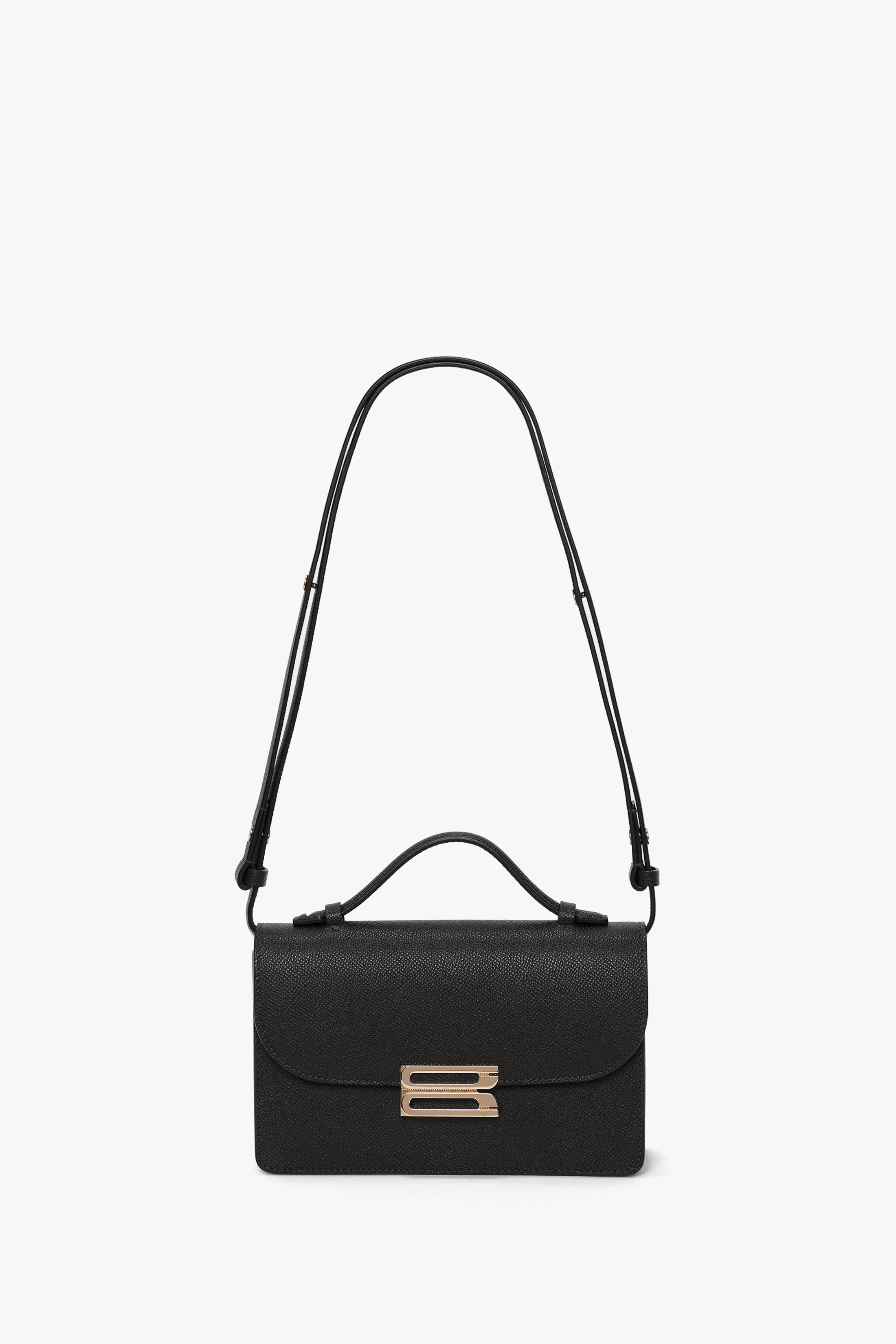 A new silhouette to the Victoria Beckham leather goods edit, the Mini Dorian Bag in classic Black is exquisitely crafted in Italy from textured calf leather and microsuede lining. It has a removable ‘smart strap’ with snap buttons for versatile styling as a shoulder, crossbody or clutch bag and features the house’s signature gold branding, which includes the discretely stamped address of Victoria’s London studio (N.202) followed by a unique serial number. Size & Fit - Height: 14cm, Width: 20cm, Depth: 8cm - Drop: 49cm - longest length. Drop: 43.5cm - longer length. Drop: 27cm - Shortest length Product Details - Top handle mini bag - The smart strap has snap buttons that easily allows length of strap to be changed - Can be worn on the shoulder or across the body - Internal double compartment - Microsuede lining - Features our signature gold branding with VB logo - Unique serial number per bag - 100% Leather - On leathers, regularly apply a very small amount of nourishing cream and buff gently using a cloth - Made in Italy