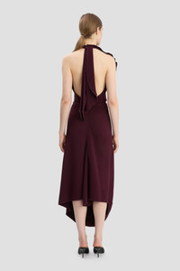 Refined but with an erotic undertone, the Backless Scarf Detail Midi Dress in Merlot is defined by feminine folds of crepe back satin and a sensuous open-back design. An elegant draped halter neckline, front pleat detail and asymmetric hemline act as a counterpoint to the seductive low back, creating a silhouette that blends polished and provocative references beautifully. Size & Fit - Fitted through the waist and hip - Fits true to size, take your regular size - The model height is 5'10’’/178cm and is wearing a size 6 Product Details - Fluid cady draped, scarf detail midi dress - Draped neckline - Low back - Asymmetric seam through front with draped detail at hem - 50% Viscose 47% Acetate 3% Elastane - Dry clean only - Made in Portugal