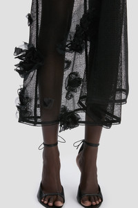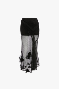 Designed with a mesh outer layer and crepe de chine under layer, the Basque Midi Skirt in Black has curved panel seams for a distinctive silhouette. With its basque waistline and pretty organza flowers, it marries feminine design codes with contemporary flair. Size & Fit - The model is 5'10’’/178cm and is wearing a size 6 - Fits true to size, take your normal size Product Details - Stretch mesh midi skirt - Organza flower embellishment - Washed cupro under layer - Asymmetric hem - Curved panel seams - Side seam zip with hook & bar closure - 100% Polyester - Made in UK