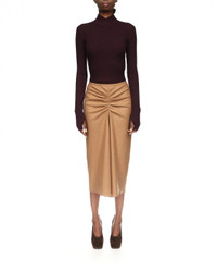 The Bela Midi Skirt in Toffee by Victoria Beckham is a mid-length, gathered skirt featuring pleating at the center front and center back. - 1425WSK006985B
