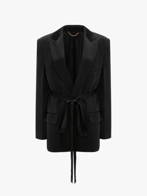 The Tailored Belted Jacket in Black embraces a feminine take on traditional suiting with its waist-defining fabric belt. Crafted from fluid crepe back satin and fully lined, it has sharp creases down the front and back sleeves, bringing subtle definition to the silhouette. Front patch pockets add an attractive and practical design detail and the classic colourway gives this piece wear-anywhere appeal. Size & Fit - The model height is 5'11’’/180.5cm and is wearing a size 8 - Fits true to size, take your regular size Product Details - Satin crepe tailored jacket fabrication with belt - Concealed button closure - Fully lined - Internal chest pocket - External chest pocket with welt - Patch pockets at the front with contrast black pocket flap lining - Sharp creases on front & back sleeve - 71% Acetate, 29% Viscose - Dry Clean Only - Made in UK